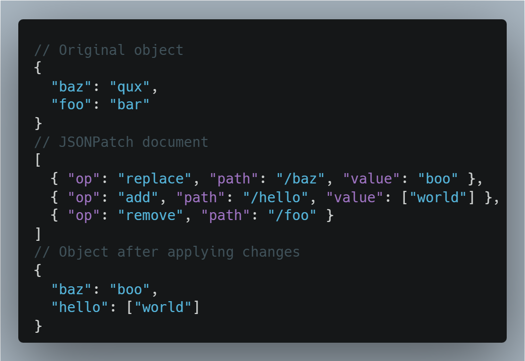 A widely adopted solution to this problem is JSON Patch, a standard defined by the IETF, that builds on the JSON format and has seen broad adoption across the current software ecosystem with a variety of libraries. At its core, JSON Patch represents changes as a flat JSON array of patch operations that must be applied onto the original object in order for it to become the desired object. Fig. 1 illustrates this structure using the example provided on the official jsonpatch.com website: